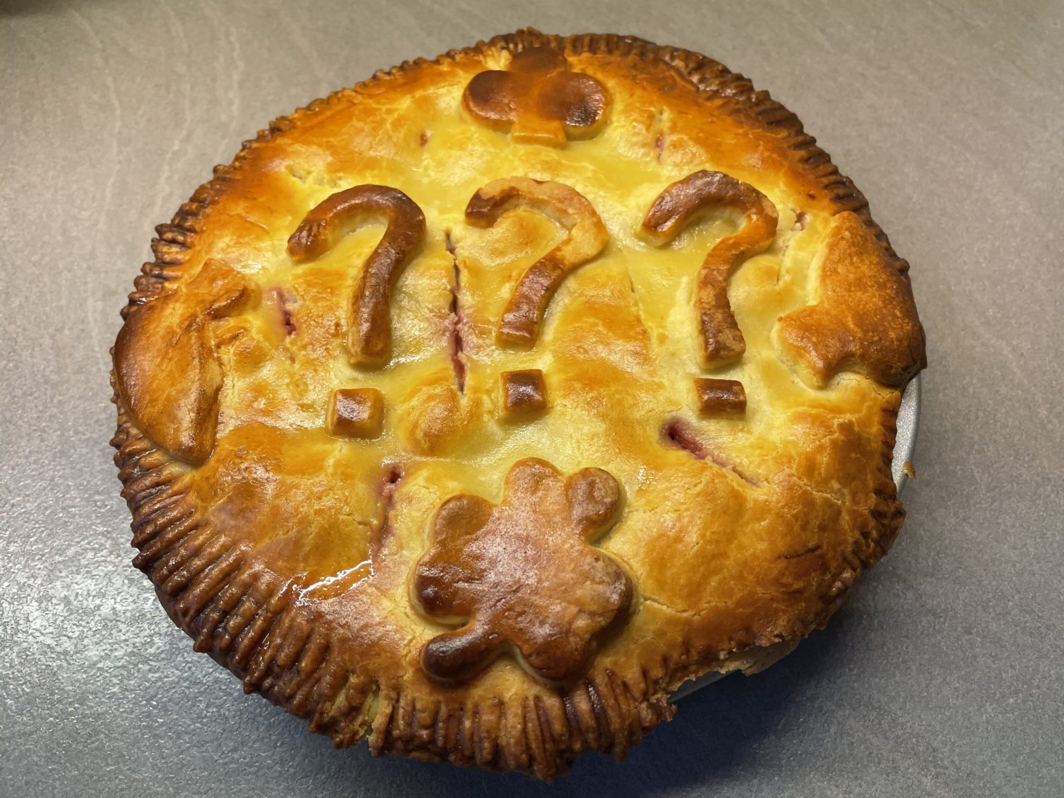 Überstehenden Teig abschneiden und daraus drei Fragezeichen formen. Fragezeichen auf die Teigoberflächen legen und Teig zwischen den Zeichen einschneiden. 1 Ei mit der Milch verquirlen und Teigoberfläche damit bestreichen.