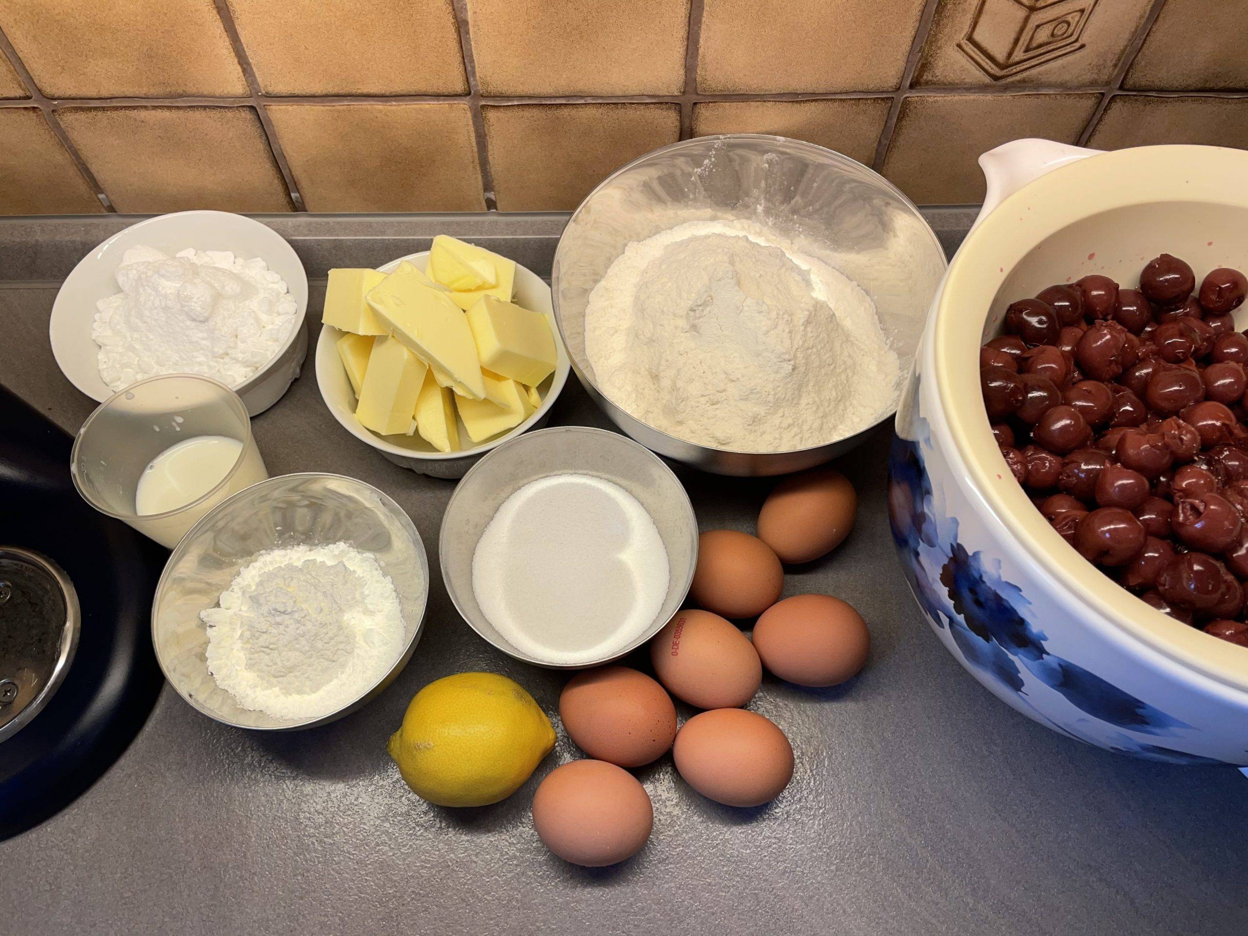 Kirschen mit Zitronenschale und -saft, 10 g (1 EL) Mehl, Speisestärke, Zucker und Vanillezucker mischen. Evtl. etwas Flüssigkeit abgießen.
